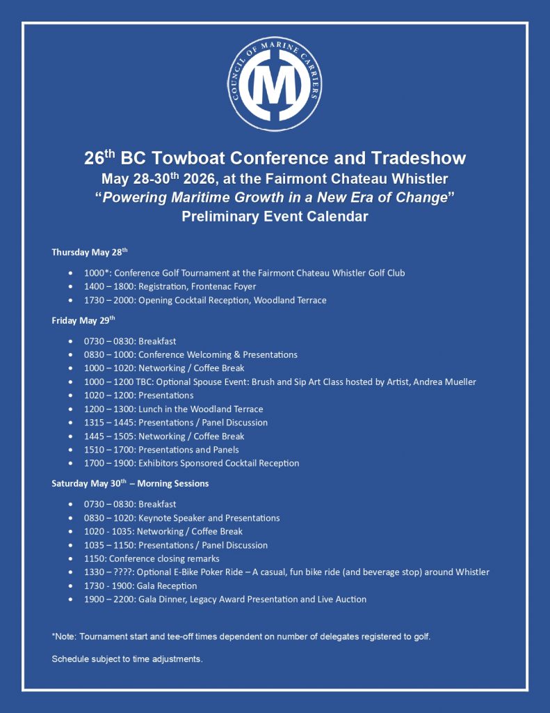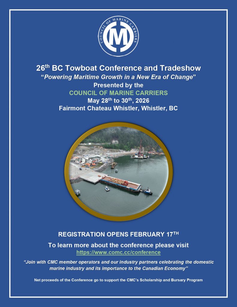 The Council of Marine Carriers would like to thank all our Sponsors, Exhibitors and Delegates for joining us at the 25th BC Towboat Conference and Trade show. This year’s event was a huge success and we look forward to hosting you again in 2026